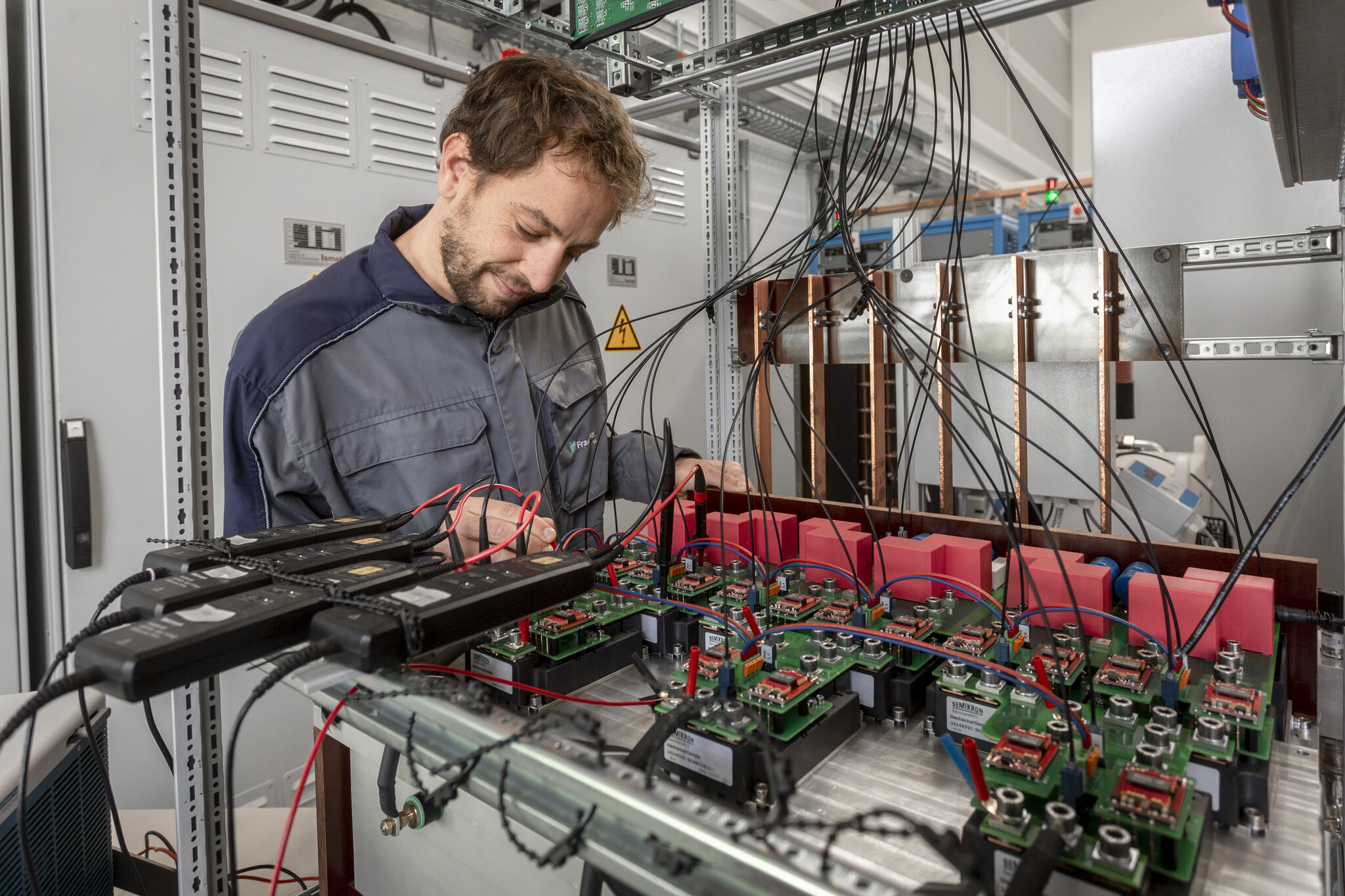 Andreas Hensel entwickelt am Fraunhofer ISE Systemtechnik und Leistungselektronik für große Energieanlagen, wie zum Beispiel große Batteriespeicher oder auch Ladeinfrastruktur für den Schwerlastverkehr. Besonderen Wert legt der Ingenieur dabei darauf, dass die neu entwickelten Systeme ressourceneffizient sind.