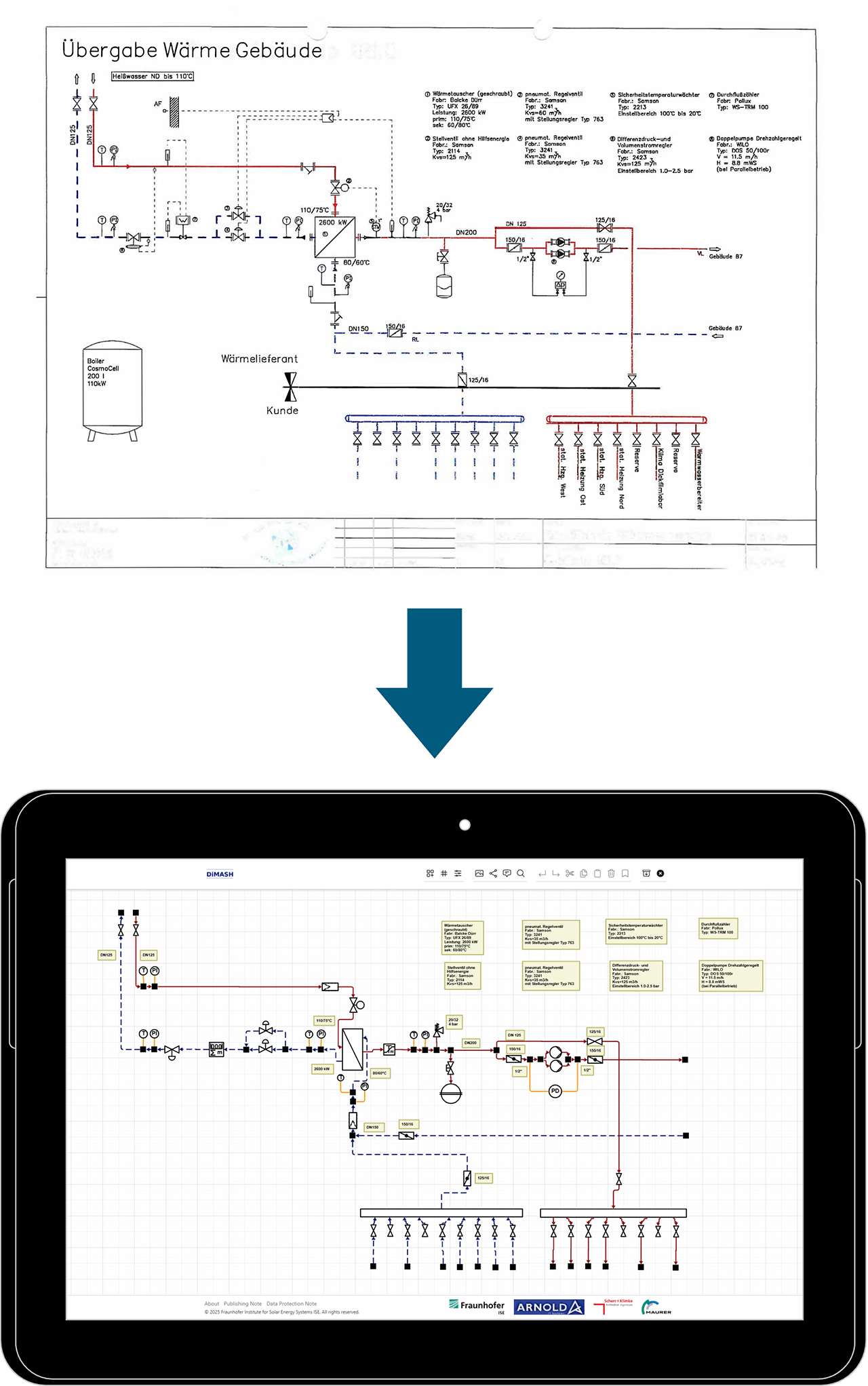 Anlagenschemata sind ein essenzieller Bestandteil der Dokumentation gebäudetechnischer Anlagen. Sie beschreiben den Aufbau der installierten Anlagen als schematisches Diagramm und sind für Bestandsgebäude in den allermeisten Fällen nur als Bild-Datei oder PDF vorhanden, oder auch einfach nur in Papierform. Soll für ein Gebäude nun eine Sanierung oder energetische Betriebsoptimierung geplant werden, muss das Anlagenschema zuerst zeitaufwändig manuell in entsprechende Software übertragen werden. Genau an dieser Stelle haben wir mit unserem Projekt »DiMASH« angesetzt.